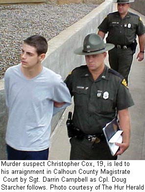 Christopher Cox, 19, was arrested at his mother's home in Spencer last Thursday morning and charged in the death of 49-year-old Russell Metz of Arnoldsburg. The suspect's mother, Chris Cox, said Metz was a cousin to her adopted son through his birth father. Cox alerted police after her son came to her home last Wednesday night with an injury to his arm. She took him to Roane General Hospital where he received stitches. He was arrested at her home the following morning. Police said Metz was slain at his residence, located less than a mile from the Roane County line. Although police are still waiting on an autopsy report, Sgt. D.H. Campbell of the State Police detachment in Grantsville said Metz appeared to have been shot and stabbed several times. "It was gruesome," said Campbell. "In 15 years it was the most brutal scene I've been in." [Click for Full story] www.thetimesrecord.net