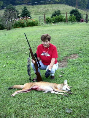 ![]() (2004)Marlene Vineyard of Arnoldsburg killed this coyote after it came in a field behind her barn. She spotted the coyote in the middle of the day, watching some cattle that was in a nearby field. The animal appeared not to be afraid of her presence. The number of coyotes in the area appear to be increasing, in fact, one of Vineyard's neighbors had coyotes enter a dog pen last year and kill some puppies.