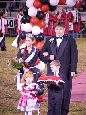 ![]() Miss Melissa Ball, daughter of Shirley Ball of Grantsville and the late Gerald Ball, was crowned Calhoun High School Homecoming Queen for 2004 during half-time at Friday night's football game. She was escorted by Jeff Ashley, son of Doy and Brenda Harris of Big Bend. The Homecoming Queen was preceded by the flower girl Miss Gracie Cooper, three-year-old daughter of Richard and Angel Radcliff of Mt. Zion and crown bearer William Baker, seven-year-old son of Larry and Vickie Baker of Grantsville. |