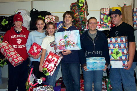 L to R: Michael Sullivan, Katie Walker, Hannah Conley, By Kelley Houchin Six members of the Calhoun County 4-H Teen Leaders participated in the club's community service project Saturday, December 11, 2004. The club members met at the Community Resources Building in Grantsville to wrap presents for the CRI Angel Tree recipients. In addition, the 4-H Teen Leaders also supported the angel tree project by adopting an angel from the tree. The teen leaders provided gifts for a 2 year old boy on the angel tree. 4-H Teen Leaders is a club for older 4-Hers. It provides older 4-H members the opportunity to continue their four fold development through the 4-H program as well as opportunities to develop leadership skills. 4-H Teen leaders assist in planning 4-H camp activities and often help teach crafts or classes at camp. They also provide assistance with other county 4-H activities such as the Halloween party and "Up All Night." Membership is open to anyone in 7th grade through age 21. The club meets on the 1st Wednesday of each month during the high school lunch period at Calhoun/Middle School. For more information about becoming involved with 4-H Teen Leaders, contact club leader Kelley Houchin at 655-7421.
