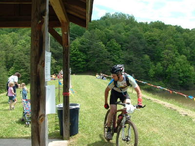 Expert/Pro rider Cassie Smith finishes up her race with a family hug By Diann Clothier It was a perfect day for the WV Mountain Bike Association's 6th Spring Point Series Race at Charles Fork Lake in Spencer this past weekend. The Aquafina Tour de Lake drew 132 racers for the 12th visitation of the round-the-lake race. Pro/Experts and Sport riders pedaled 30K, while the junior sports, beginners, and non-point racers toured the lake only once, with a 15K course. While the course took its toll on chains, tubes, seat posts, shocks and derailleurs - not to mention many a rider's skin - Pro/Expert TJ Platt rode a super fast 30K race, finishing up his 30K tour in 1 hour and 40 minutes. The unofficial race board top three per class; Men's Pro/Expert Open: TJ Platt, Steve Hill, Joey Riddle Women's Pro/Expert OPen: Cassie Smith, Mandi Riddle, Christine Buerke. Men's Vet Expert 35+: Gerry Pflug, Justin Pokrivka, Steve Thaxton Men's Master Expert 45+: Scott Root, Alan Doss, Charlie Patterson Single Speed: Greg Moore, Steve Harouff, Jesse Stevens Men's Jr Expert 18&under: JJ Ford, Cale DeVall. Men's Sport 19-34: Nate Arnold, Jon McClung, Kevin Fletcher Women's Sport 19-34: Charlene Vrable, Lisa Stover, Amy Dunkin Men's Sport Vet 35+: Joseph Szcryrbak, Scott Frame, Dannie Hillery Women's Sport Vet 35+: Ruth Cunningham, Laurie Johnston, Shelly Ware. Men's Sport Master 45+: Doug Wayne, Gene Wells, Bruce Williams Clydesdale 200 lb+: Steve Ware, Toney Bowie, Robert Darnell Men's High School 15-18: Chris Finch, Roalnd Sink, Corey Meadows Men's Jr Sport 14&Under (15K): Corey Chambers, Cai Clothier, Eric Estep. Attached Pictures: "003" - Expert/Pro rider TJ Platt finds time to properly dispose of his trash as he begins his 2nd lap "005" - Expert/Pro rider Cassie Smith finishes up her race with a family hug |