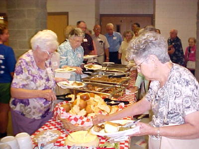 ![]() Emcee William Ice (above left) of the Class of '48 welcomed the returning students and their family members and Superintendent of Schools Ron Blankenship (Class of '65) said "We extend to you the warmest welcome." The alumni group's $1000 scholarship was awarded to Timothy R. Butler of the Class of 2005. Four classes celebrated special anniversaries. "We listened to Elvis, the Beach Boys, the Stones and the Big Bopper," said Roger Propst (above center) of the Class of 1965, who took the risk to read the Class Prophecy and recalled with fondness some memorable teachers. He said everyone recalls the assassination of John F. Kennedy in 1963. Propst, alluding to the likely demise of old Calhoun County High School building in Grantsville, said "School was not about a building, it was about the people." Bill Umstead (above right), speaking for the class of 1960, recalled receiving inspiration from Social Studies teacher Kenneth Hall. "I knew he was about to impart inspiration when his face turned red," Umstead said. "He went to get his inspiration from another room and returned to inspire me. His inspiration broke in several pieces, flaying across the room. No one received more inspiration than I did," he said. "It was hula hoop time. We were listening to tunes like "Young Love" and "Wake Up Little Susie," and watching TV shows like "The Real McCoys" and "Maverick." Elvis was hot. Fred Barnes helped us appreciate flowers. The class heard the news that Russia had launched the first satellite - Sputnik, and Hawaii and Alaska increased the 48 states. Umstead said "We learned about caring and compassion for others and even a little about love."