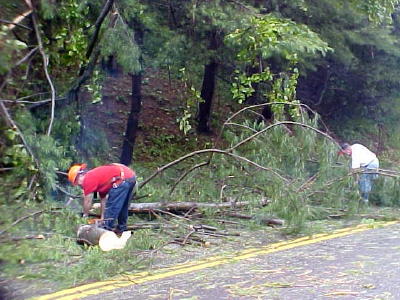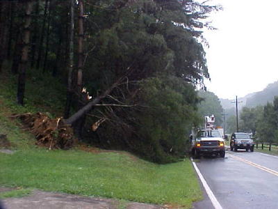 A narrow micro-storm swept across Phillips Run near Grantsville Thursday evening, downing trees and branches and leveling gardens. Grantsville firemen and EMS worker Steve Health said "It was a really powerful wind. It knocked the air conditioner out of my window." Health said the storm was very brief. One large tree feel across telephone lines along Rt. 16, and Frontier workers responded to remove the problem from the highway. On either side of the swath there was no damage, no rain. |
