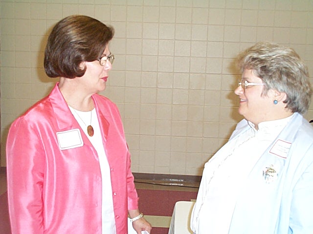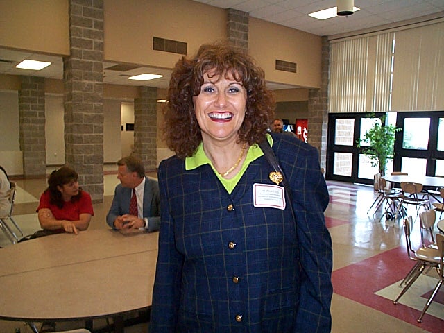 ![]() New board member Barb Fish (L) talks with Arnoldsburg principal Sheri Graham (R)
