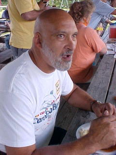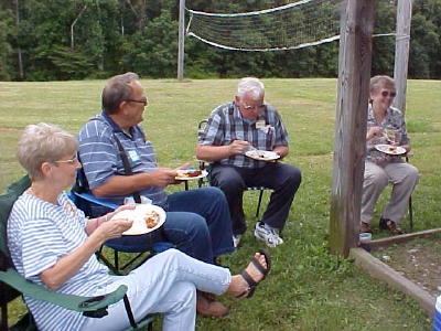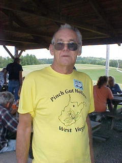 ![]() Alfred Lee Stemple (left) from "Pinch Gut Hollow" near Fairmont returned, a hollow so narrow you have to "pinch your gut in to get through it" and (right) Calhouner Delford McDonald enjoys afternoon gathering