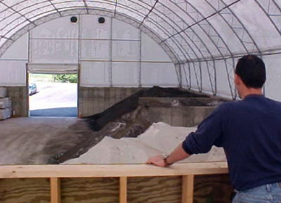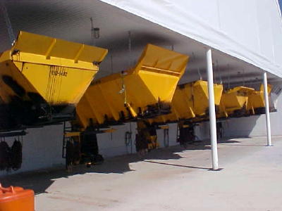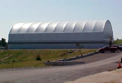 At the rear of the building, ice-melting spreaders are hung for easy access Published 2005 Chilly temperatures are a reminder that winter is soon to come. And there is a new home for fighting winter weather problems at the The WV Department of Highways garage. The giant Cover-All salt and sand storage building is constructed from a number of materials, but the main steel frame is covered by a long-lasting fabric, and will house salt, cinders and other products which need to be protected from the elements. Trucks can drive straight in the building for quick loading, and the ice-melting spreaders are hung in a section at the rear of the building, for easy installation on trucks. The space-age buildings use natural night, the building generally stays about 15 degrees warmer than the outside temperature in winter. CoverAll is selling the buildings across the US for use for everything from ice rinks and sports arenas to storage units and retail outlets. They are also being used for fairs and horse tracks. Highway department workers attended the open house, which dedicated the building to the winter weather ahead.