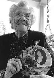 Soon to be 105 years old, Roxy Ellyson of Gilmer County sits on her porch swing, holding a decorative metal plaque, including a picture of herself at about the time of her marriage. Photograph by Neal Menschel.By Harriet Whipkey Roxy Gay Williams Ellyson speaks with amazing clarity for someone who will be 105 years old this October 1. "I've seen Halley's Comet twice," she says. "I clearly remember the first time. I was about 10 years old, and I was at my brother Roy's home on Lower Big Run. We took a lantern and went a ways back on the hill. 'Course, some neighbors went, too. Took us some food and went up there and watched for Halley's Comet." It was a cold, clear night in Gilmer County as they built a fire and watched what looked to Roxy like a "big star with a tail." Roxy was born in 1900 in Gilmer County about five miles above the mouth of Sinking Creek at what is known as Salt Block Run. She was one of eight children of Ira and Laura Isabelle Williams. The family's home was a log cabin with four large rooms â two up and two down â plus an add-on kitchen. They heated and cooked with both wood and coal, and they got their water from a dug well. When Roxy was four years old, the family moved into a larger frame house on the same property, and the log house was moved and converted into a barn. "From the time I can remember, I had jobs to do," Roxy says. As a small child, she was given the chore of shooing the flies off the table before the family sat down to a meal. "My mother taught me to crochet before I started to school. I used to sit on a little stool at her feet and watch her, and I learned like that." There were many life skills needed for rural living, and Roxy learned them all. You can read the rest of this article in this issue of Goldenseal, available in bookstores, libraries or direct from Goldenseal. It is available at retail stores in Glenville, Grantsville and Spencer.