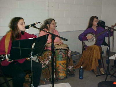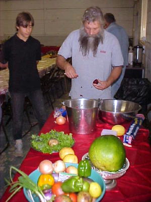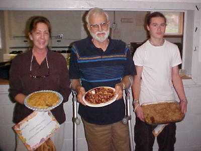 ![]() (L-R) Janet Siers, Jim Labaw and Cedar English The highlight of the dinner was the Apple Dessert Contest. First place winner of $50 was Cedar English of Chloe for his Applesauce-Huckleberry cake. Jim Labaw of Chloe placed second, winning $25 with his Cran-Apple pie. Janet Siers, also of Chloe, was awarded third place and $15 for her French Apple pie. Only locally grown apples were used in the recipes. Entries were judged on taste, appearance, ease of preparation and nutritional value. Fourteen delicious offerings were entered in the contest. Judges were Chloe Post Master, Paul Drennen, Calhoun Chronicle reporter, Lisa Minney, and Dianne Weaver, co-editor of the Hur Herald. Some of the mouth-watering wild food dishes included venison stew, buffalo liver and onions, potato soup with Puffball mushrooms, roasted wild turkey, bean stew with lambs quarters (wild white spinach), sautéed milk weed greens, and elderberry bread and jam. Traditional fare was offered for the less daring, including, salads, fried chicken, roasted potatoes, calico beans, squash, and assorted casseroles. The event was free and open to the public with the Calhoun County Kitchen Band providing entertainment. Homemade and handcrafted items were raffled and a "food to art" demonstration was a crowd pleaser.