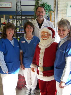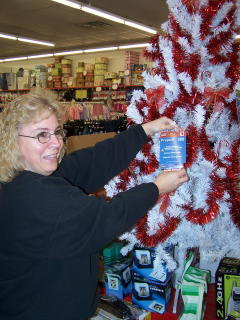 ![]() Darlene Wilkison at Silk Plus touches up her Christmas tree (left) and the J & B Drug Store folks spread their good cheer (right)
