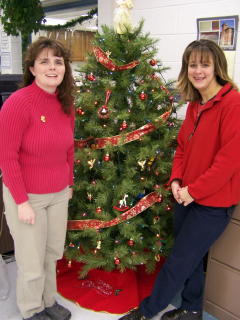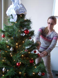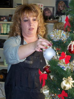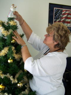 ![]() Jessie Ferguson has the holiday spirit at Minnich's (left) while Holly Burch completes the tree at attorney Howley's office (right)