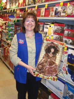 ![]() Pam Davis wears her cheerful smile to welcome customers to Family Dollar (left) while the crew at Baker's Mart "clown it up"(right)