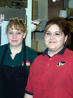 ![]() Linda Fivecoat takes time to decorate her beauty parlor (left) and pizza makers Meloney Villers and Tabitha Collins take a 60-second break (right)