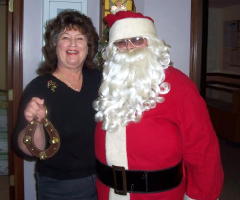 ![]() (L) Driver, Kelly Grogg and Cook, Kelly Hanes, enjoy some of the goodies brought in for the luncheon (R) Brenda Sisson welcomed Santa (Donnie Little) to the center. He was passing out cheer to the seniors