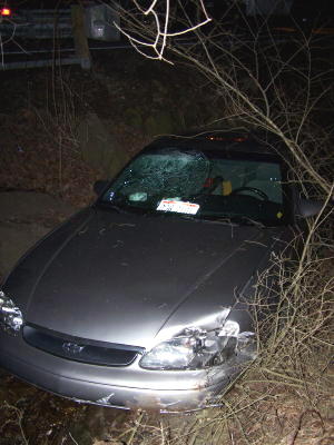 CAR LANDS IN CREEK BED AT MILLSTONE |