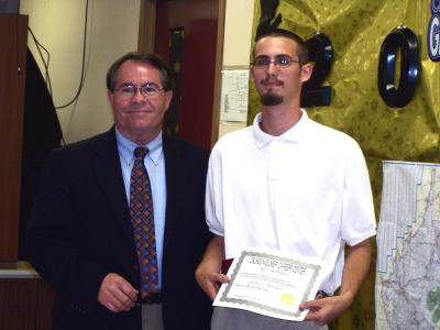 ![]() Calhoun Superintendent of Schools Ron Blankenship, presents the Earl J. Gainer Award to Josh Hanshaw of Chloe, for his outstanding performance at the Calhoun-Gilmer Career Center at Senior Appreciation Night. Gainer (1927-1990) was director of the center from 1975 to 1988. |