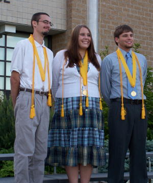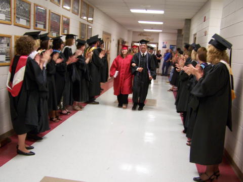 ![]() L-R Joshia Hanshaw, Adrienne Brown and Mitch Cunningham Adrienne Brown and Mitch Cunningham gave valedictory addresses, saluting their class and recalling school memories, as did Salutatorian Joshua Hanshaw. Jim Sullivan presented the popular power point presentation of class memories, photographs and prom movies set to music, and the school choir performed. Offutt issued special recognition to students who received the President's Education Awards, and then presented a special award from Gov. Joe Manchin to Larry Wease for perfect attendance during his four high school years.