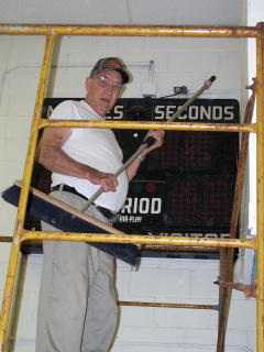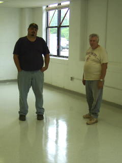 ![]() Mt. Zion resident Harry Curry is doing cleaning, fix-up and painting at Arnoldsburg Elementary School, an employee of the Senior Community Service Employment Program, shown here working in the cafeteria. James Overbaugh (R) and Joe Taylor (L) put several coats of wax on Arnoldsburg school floors, readying for the new school year. |