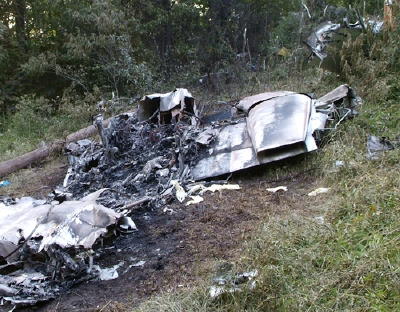 | Story and Photos by Drew Moody For the Hur Herald drewmoody@verizon.net Witnesses said they saw a puff of black smoke as the twin-engine Cessna crashed in a heavily wooded area in rural Braxton County, at about 10:35 a.m. Friday morning. The plane crashed immediately after take-off. The plane clipped tree-tops as it went down and falling parts scorched the earth. The debris field was perhaps 50-square yards. It ended it's descent just one-half mile from the Sutton Airport, where it had just taken off, in the Elk River Wildlife Management Area near the rifle range.