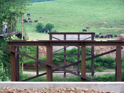 ![]() Cain's 30-ton bridge is a dream come true Big Bend resident Francis Cain said "I've always dreamed of having a bridge (across the Little Kanawha) to my house, and now it's happening." The well-known Calhoun farmer and oil and gas man has been fording the river for years and using a swinging bridge to walk to his house. Construction started on the all-steel 30-ton "Bailey Bridge" in April, by contractor Turman Construction of Barboursville. "It has been quite an undertaking," said Cain, who said some of the bridge company officials and workers go back to his school days at West Virginia University in the late 1940s. The main part of the bridge, including the steel mat floor, will be skidded across the piers. "We hope to have it completed by the first frost," he said. |