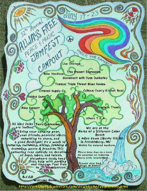 to support the Always Free Jamfest in July. Barn Jams will be held every Saturday night at the Horse of a Different Color Ranch, just outside Arnoldsburg, WV during the summer season. The mike will be open unless there is a special scheduled event that night. $3 a head unless otherwise stated, and all musicians who plan on playing get in free. Plenty of camping space available. Any bands or musical acts interested in scheduling a Saturday night contact 304-655-8818 or erthma420@excite.com July 1 - Cookout & Swimming party. All you can eat. Live acoustic music on stage. 5:30 to ?. 7 bucks a head. Rain or shine. Interested in performing? Call 655 8818. July 17 to 23 - Always Free Peace & Music Jamfest. Camping all week. Swimming, hiking, jamming, drumming. Live music on stage Friday, Saturday, and open mike Sunday. Regional and out of state bands and musicians are scheduled to play, with a wide variety of genres from old time traditional to alternative rock, jazz, folk, and metal ... Food is potluck. This entire event runs on donations of food, labor, and talent, so please bring something to share. For more info and updates on all events email erthma420@excite.com or go to downhome Also, we are looking for any bands and musicians interested in scheduling Saturday Night Barn Jams in August. Contact erthma420@excite.com or call 655-8818. We are looking for a GOOD bluegrass or square dance band who would like to donate their talents on Thursday, July 20 at the Always Free Peace & Music Jamfest in Arnoldsburg. There should be a large and appreciative audience. This is a great way to promote yourself, and you are welcome to sell band CDs and merchandise. Contact 655-8818 or email erthma420@excite.com soon as possible so we can finish up our advertising. Check out downhome for more info.