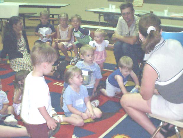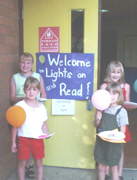 Article and Photos Submitted By Kelli Whytsell On Tuesday, July 24th another Lights On project started at Pleasant Hill Elementary School. The program "LIGHTS ON and READ!" was open to children from birth to 10 years of age from anywhere in the County. A total of 38 children and 23 adults attended the reading workshop. Children participated in singing and story-time, made crafts and enjoyed a snack. All children were given a new book. The next workshop is scheduled for Tuesday, August 21, 2001 Toddlers 5:00-6:00 and Preschoolers 6:30-7:30 and Tuesday, August 28th for grade school 6:00-7:00 pm. The program is open to anyone wanting to attend.