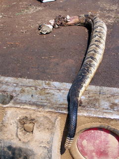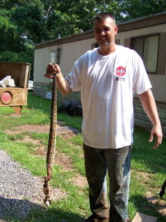 ![]() Pictured is Ivan Holbert's 42" rattler (left) held by John Newell (right) Calhoun, in times past has been known for rattlesnakes. Tales abound about the reptiles from the Bear Fork wilderness to Rattlesnake Knob, a short distance from the faded village of Joker. But this week at least two rattlers have been killed in northern Calhoun, the first by Ivan Holbert near Hartley and the second by Mike Sims of Yellow Creek. Holbert killed his 42" rattler near a gas well operation, running over it with his truck, and Sims killed his 40" rattler on Yellow Creek. Both had eight rattlers plus a button.