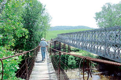 Francis Cain walks across a wooden, swinging bridge that Military engineering units have historically designed Bailey bridges for military purposes. They are pre-fabricated truss bridges. Donald Bailey, a civil servant in the British War Office, invented the structures during World War II to provide means for forces to cross waters in Europe. They were first used in Italy in 1943. Bailey parts are made of standard steel alloys and are simple enough to assemble by hand. Cain needed some heavy equipment to get his project started, but now workers then pieced it together like a toy construction set. "It's just like a Tinkertoy or Erector Set," said Cain's wife, Donna, 79. The couple has been married 57 years with five children. "I hope I live another 10 years just to enjoy the new bridge," she said, jokingly. "The last two years have gotten terrible walking across that swinging bridge. We have to move on." She said the ragged, wooden bridge, resembling something out of an Indiana Jones movie, poses a danger to pedestrians, especially to her 12 grandchildren and 10 great-grandchildren. Francis Cain built it in the 1960s. He cautions folks walking on it, "Don't look down." "When it was first built, we thought it was as good as sliced bread," he said. His father bought the property in 1927, and the Cain family lived in a log house. Cain went on to serve in Guam during World War II with the 20th Air Force. He also earned a bachelor's degree in agriculture at West Virginia University. But he was attending Potomac State College when he first met his wife at a Keyser grocery store. "I was downtown and probably should've been studying," Cain said with a grin. Building your own bridge can be a drawn-out process, the Cains say. One must first acquire a permit from the Army Corps of Engineers to develop a private bridge. Engineers working on the project had to resubmit the application a few times. The neighboring area, mostly rural and forested, may have smaller private bridges over streams, but nothing as extensive as a steel Bailey bridge. Cain doesn't deny it will lessen the burden of work on his farm. He says he's had to find ways to haul oil and gas rigs across the river, as well as trucking cattle and hay elsewhere. Several people in the county rely on the oil, gas, timber and farming industry, he said. "To us, this bridge is a big thing," Cain said. He chose a Bailey bridge because he believes it's the most cost-efficient. His son, David Cain, who's fronting the bridge assembly efforts, said he's spoken with a few military friends who recommended building a Bailey bridge. "There are just 28 basic components to this bridge," David Cain said. "Once you start doing it, it's easy. Things just roll into place." The son worked on construction jobs in Washington, D.C., in the 1970s and has done contracting work in the Calhoun County area for several years. But he has never put a bridge together. He and a few local workers have battled 90-degree days clamping steel pieces together and sweating profusely. But he's looking forward to completing the project, as a sheer personal accomplishment and as a favor to his parents. "I remember being 12 when the swinging bridge was put up," David Cain said. "Before that, we had to take a boat across the river. That was different. There weren't many people around growing up in those circumstances." Contact writer Jake Stump at jakestump@dailymail.com or 348-4842 |