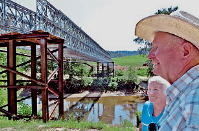 Donna and Francis Cain gaze at a steel bridge under construction BIG BEND -- Francis Cain has grown tired of walking across a wobbly 300-foot swinging bridge every time he leaves his house. If the water's low enough in the Little Kanawha River, which divides his property from W.Va. 5, he carefully drives through it. Cain, 81, remembers boating across the river to get to the main stretch of road in this tiny Calhoun County town outside of Grantsville. Now he and his wife will get to rest their feet and the shock absorbers on their vehicles. Laborers have pieced together a 30-ton Bailey bridge that connects the Cain property to W.Va. 5. Francis Cain, a well-known farmer and independent oil and gas contractor in Calhoun County, is footing the bill for the private project. He chose not to disclose the costs. But he expressed joy in finally having access to a bridge after spending most of his life on the family's 1,500-acre farm. Contracting firm Turman Construction of Barboursville erected the steel piers in April, and local workers began assembling the rest of the 320-foot long steel bridge in late July. As the bridge work was wrapping up recently, Cain was anxious to drive the first vehicle across it. "I told 'em, 'We're first,' " he said.