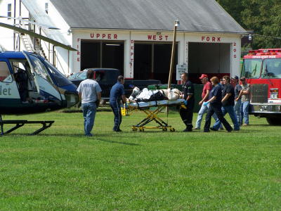 Metheney is taken from ambulance by emergency workers An 83-year-old Stinson man was injured Sunday afternoon when his four-wheeler was involved in a collision with a van. Arley Metheney was life-flighted to Charleston Area Medical Center by HealthNet, reportedly suffering from possible fractures and other injuries. The four-wheeler and van collided just south of Stinson Grocery on Rt. 16 about 1 p.m. Calhoun EMS and the Upper West Fork Volunteer Fire Department responded to the scene, transporting Metheney to the park to meet the chopper. A relative of Metheney was pinned under a four-wheeler in 2004 at Stinson while berry picking. After surviving a 14-hour ordeal, Nancy Shelton Sigmon, who was 57 at the time, was permanently paralyzed with a broken neck.