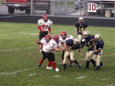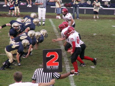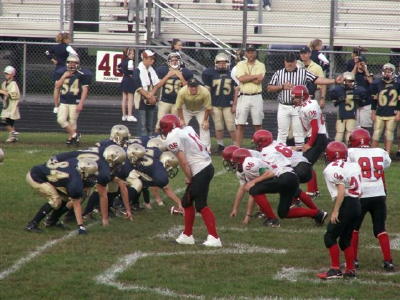 ![]() CMS Defensive Line (Photos by Jennifer Miller) By Roger Propst The Calhoun Middle School football team traveled to Spencer on Thursday evening as it spent its second week in a row on the road. The Red Devils saw some improvement from the first week of the season at Doddridge, but still came up on the short end of a 22-6 score. The game began with Calhoun kicking off to the Yellowjackets who brought the kickoff back to the CMS 48-yard line. Spencer then needed only nine plays, all on the ground, to reach the Calhoun end zone. The two-point conversion attempt was good, and the Yellowjackets led 8-0 with 3:33 left in the 1st Quarter. Calhoun's 1st series began after the kickoff at its own 26 yard line. On the first play from scrimmage, tailback Ben Laughlin took the ball off the left side of the line for 15 yards and a Red Devil 1st down at the 41. However the SMS defense stiffened and held the Red Devils to minus yardage on the next three plays, forcing a Corey Metz punt to the SMS 35-yard line.