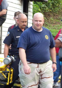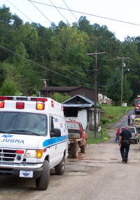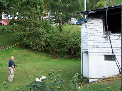 Chief Nicholson and Fire Marshal Baltic (left) conduct Coroner Ed Messenger remained on scene until the Fire Marshal arrived, as did the Grantsville VFD and Calhoun EMS. The body has been sent to the State Medical Examiner's office. Neighbors said the victim had returned to her house after her daily visit to Grantsville's senior citizens center. About two hours later flames were spotted coming from the house, and a call was made to 911 about 2:45 p.m. Brenda McBride, asst. director of the senior center, said "Some of our staff said they gave her a hug when she left yesterday, telling her we'd see her Monday." "She really enjoyed the center," McBride said, "And going to the Dollar General Store. Neighbors said Richards was pretty much a loner, but was "a kind and gracious lady," who didn't like to burn her electric lights at night, using candles instead. Her nearest relative is a son who lives in Ohio. Neighbors said he visited his mother a few weeks ago. South side residents said Ms. Richards had likely lived in the same house since World War II. The woman's death is among few fire fatalities in the county during the past 25 years, although firemen said there have been several close calls. Read earlier story about fire
