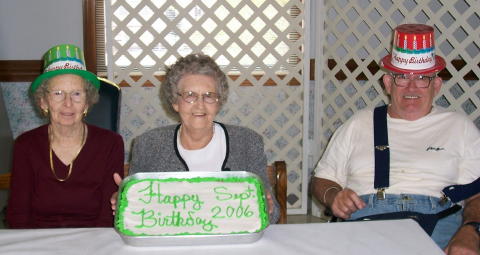 ![]() Celebrating September birthdays at the Calhoun County Committee on Aging, Grantsville Center, were (L-R) Margaret Cunningham, Elah Whisman and Tom Hardcastle. The CCCOA Choir led by Betty Curry provided entertainment accompanied on piano by Mary Umstead. |
