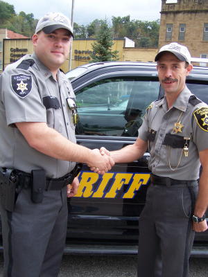 ![]() Deputy Craig Gherke (left) and Sheriff Carl Ballengee Craig Gherke, a 28-year-native of the county, is one of Calhoun's newest deputy sheriffs. In addition to himself, Sheriff Carl Ballengee now has a staff of four serving the county. Gherke is a two-hatter, also serving as fire chief of the Grantsville Volunteer Fire Department. He has served the community for the past 10 years as a volunteer fireman and six years as an EMT for Calhoun EMS.