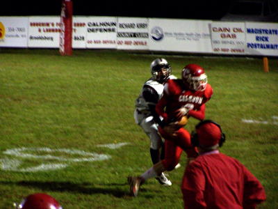 By Gaylen Duskey Friday 13th is a day of bad luck for those who believe. For the Calhoun faithful there is reason to believe following a 38-27 setback at the hands of Roane County at Mount Zion. Calhoun's bad luck included at lot of little things and some big things too. To wit: Roane County, a team that had been plagued by penalties all season long, was whistled for four penalties for 17 yards. Calhoun, on the other nailed for 52 yards in penalties including several on holding plays that killed drives. Roane County would call a time out then run a shuffle pass that would go for 20 or 30 yards and a first down. And this happened almost every time the Raiders called a time out. Twice passes went through the hands of Calhoun receivers into the hands of Roane defenders. Nick Whytsell, one of the most accurate kickers in the state, missed a short field goal attempt that would have given the Red Devils a 10-0 lead. Roane County fumbled the ball into a big patch of open field only to have the Raiders chase it down for a first down. A Roane County kickoff went awry as the kicker accidentally topped the ball only to have the ball careen off a Calhoun lineman. Roane recovered. The Raiders admitted it was not a planned play but a bad kickoff that turned into a wonderful thing for Roane. The last thing was a big thing since it came right after the Raiders had scored a touchdown to take a lead, 18-14. The Raiders then marched down for another score and a 24-14 lead. That was two of the three touchdowns the Raiders scored in the third quarter as they roared ahead and the Red Devils were never able to catch up. But the game didn't start out that way. Calhoun scored 20 seconds into the game when Caleb Hart, who would leave the game at halftime, hit Josh Deweese on a 71-yard option pass. The Red Devils drove down the field after forcing a Roane punt but missed a short field goal attempt when the drive stalled. Roane then got back into the game with a touchdown but missed the extra point - one of five extra points the Raiders would miss on the night.