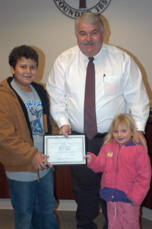 Spencer Mayor Terry Williams honors The City of Spencer presented Billy Frisk a certificate of appreciation for saving his little sister who fell into Spring Creek when she was on a walking bridge on the 119 by-pass. His sister is three-year-old Jalynn Townsend. Local donations are being used to buy Billy a new bicycle, among other items, according to Mayor Terry Williams. Billy is in the 8th grade at Spencer Middle School. |