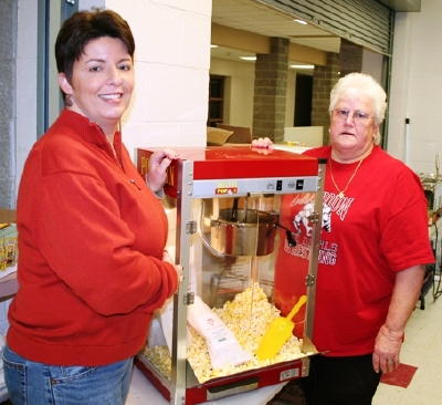 ![]() Pat Laughlin (L) and Irona Yeager (R) A ballgame just isn't a ballgame without the aroma of fresh popcorn popping. Pat "The Land Lady" Laughlin, of Farmhouse Realty, is shown donating a new commercial popcorn machine to Irona Yeager, president of the Calhoun Middle School Boosters. The new machine will be used to raise money for the Boosters.