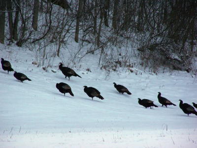 Calhoun's winter landscape is riddled with turkey (and deer) in the fields and on the hillsides, foraging for food (Photo compliments of Cathy Dickey)
