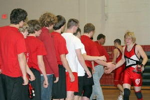 Senior Tyler Bain is congratulated by team after his win