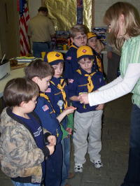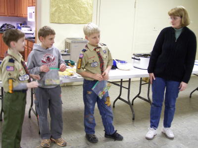 Den leader Vicki Baker gives awards Calhoun's Cub Scout Pack 436 held their annual Blue and Gold Banquet last night at the First Baptist Church in Grantsville. Scouts were recognized for their accomplishments and later given prizes, savings bonds and other gifts donated by area businesses and individuals.