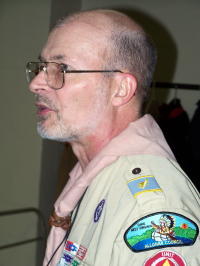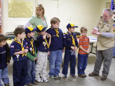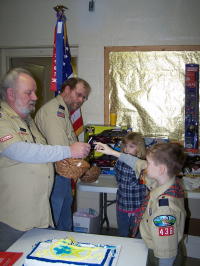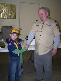 ![]() Paul Funk recognizes Eli Stump (left) for placing #10 in about 400 in the Pinewood Derby, and Chasidy Rush (right) issues special recognition