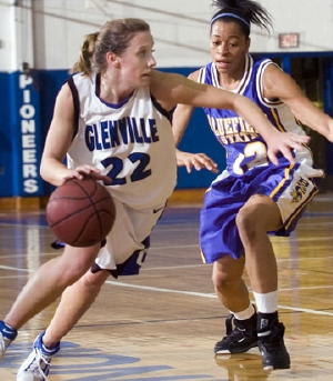 | Article and photos by Drew Moody Thursday's victory against Bluefield State 82-54 wrapped up the regular season for fans at home. The Lady Pioneers are on the road Saturday facing Davis & Elkins. And Rachel Redick is within a mere 16 points of being the all-time scoring female in WVIAC history. Prior to game seniors Rachel Redick, Lauren Strong, Casey Taylor and Christy Alltop were honored along with their families. The night was not without a few surprises, including West Virginia Governor Joe Manchin III sending Region 2 Representative Dot Underwood to present Rachel Redick with a Distinguished Mountaineer award. The Governor had a prior commitment, Underwood said, and regretted not being able to present the award to Rachel in person. She said the Governor wished to honor Rachel and her many accomplishments - on and off the court. And then very graciously added, "The night is about Rachel." Rachel Redick was chosen as a "Distinguished Mountaineer" in part because of her "exceptional basketball career," but also for all the other things she's done while a student at Glenville State College. Rachel is an honor student and takes her studies as seriously as winning on the court. Lady Pioneer head coach Steve Harold has said not only has Rachel volunteered to help at Glenville's summer basketball camps for girls, but she's also followed several young players careers as well, and has become a role model for many area youth. Several Lady Pioneers help with the camps as well. And Rachel isn't the only Lady Pioneer with a brain. Several are honor students and some plan on pursuing careers in medicine; others in law. Redick is committed to being an elementary school teacher. Recently Rachel was talking about her parents and mentioned how thankful she is they're proud of her and her family is so close. The immediate response was, "Who wouldn't be proud to have a daughter like you Rachel - anyone would be." What higher compliment could someone give than to share with friends and co-workers they hope when their children grow up they're like Rachel Redick? Rachel is a gifted athlete to be sure, but that just grazes the surface of who she is. And as she and the other seniors wind up another successful season it becomes a time for reflection. And like so many others before them, there's a realization of how much the Lady Pioneers and Glenville State College has affected them; but also an appreciation for how much they've meant to so many here. Redick and some of her teammates fought back tears as they walked on the court - their home court - for the last game of the regular season. Luckily for them and the fans, there's a post-season to look forward to.