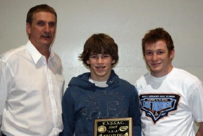 ![]() Coach Chris Morris (L) congratulates Cody after the win Photos by Patty Haught Calhoun High School Freshman, Cody Clark (38-4) won the West Virginia State wrestling tournament by beating senior Shawn Sexton of Independence. Cody's only four losses of the season had come from Sexton. Cody proved to be a real fighter and didn't give up. Clark took a 6-5 lead in the first period, and kept his momentum, winning with a takedown in the last 23 seconds of overtime, 13-11.