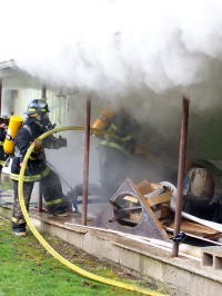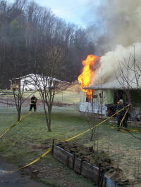 Elizabeth-Wirt firemen fight the fire (left) while Firemen kept the blaze under control, but when the structure ventilated, flames and smoke erupted. Firemen drafted water from the creek and shuttled tankers for more water to put on the blaze. The Grantsville Volunteer Fire Department dispatched three trucks to the fire at 8:12 a.m., with mutual aid being provided by the Elizabeth-Wirt VFD. The residence is located about three miles off State Rt. 16 on Annamoriah Creek, the Hur-Joker Road.