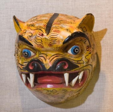 Jaguar Mask - Used each Spring as a learning ritual to teach ANCIENT HISTORY OF MASKS Tubesing has traveled extensively throughout Mexico and into the high mountains of Guatemala searching for masks. Some were purchased in antique stores, others were obtained in very rural areas from the artist, and a few were found on e-Bay. The use of masks are documented back to 40,000 B.C., Tubesing said. Throughout history they've had a variety of purposes ranging simple costuming for parades to sacred rituals. Most are nothing more than consumable parts to costumes. "I collected it from an anthropological perspective," Tubesing said. He has focused his efforts of study on how the masks functioned in the various cultures. His interest has been in accurately representing different types of masks, and has managed to assemble the collection without investing much money in the items. The scope of the collection includes items that were created simply as works of art, to representations of a continuing traditions, such as the Japanese masks. While others, such as the Seven Deadly Sin collection, represents a relatively new style from Mexico. "This is a museum quality show," Chapman added. "It's better than an 'Indiana Jones' movie." ('Indiana Jones' is a fictional professor, archaeologist, adventurer and main character of the 1981 movie "Raiders of the Lost Ark," starring Harrison Ford. Two other movies based on the character were released in 1984 and 1989. A fourth 'Indiana Jones' movie, also starring Ford, is scheduled to be released in May 2008.) "You can take a trip around the world and get insight into a culture," Chapman continued. Represented in the collection is an array of different cultures, different beliefs and different societies.