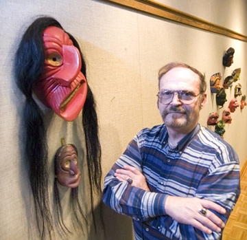 Rick Tubesing stands beside an Iroquois Curing Society mask (Photos by Drew Moody) By Drew Moody Entitled "Transmutation," the mask collection of Rick Tubesing is both a journey through time and cultural traditions. Some are simply done as sculpture, others are part of a costume, and a few are examples of ceremonial masks. The roughly 150 masks displayed in the Fine Arts Center gallery are from across the globe. While the majority are from North and South America, the collection also features a variety of masks from Africa, Japan, Indonesia and Tibet. Duane Chapman, fine arts chairman, brought the exhibit to Glenville State College to coincide with multi-cultural fair activities which brought hundreds of middle school students to the college for a variety of day long presentations. Students from Elkins, Tygarts Valley and Braxton County attended the events. Tubesing, retired as Glenville State College's library director eight years ago. However, prior to his journey bringing him to Gilmer County, he was somewhat of a globe-trotter, traveling and teaching at several prominent universities. He's a veteran of the U.S. Navy, earned an undergraduate degree in English Literature from Yale, and successfully completed a master's degree in anthropology - before later getting a second master's in librarianship.