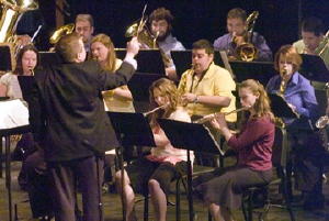 _______ By Drew Moody A Friday night concert, an annual Spring event for the Concert Band, culminated in an unusual and energetic rendition of 'Godzilla Eats Las Vegas' at the Fine Arts Center Auditorium. Costumes and props added to the suspense as some percussion members donned what looked to be "Men in Black" shades, the keyboard player wore a gold cape, and Godzilla even made an appearance throwing music around lumbering across the stage.
