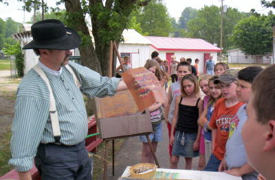 ![]() Fifth graders from Calhoun Middle School and third and fourth graders from Arnoldsburg Elementary were taken on a field trip to the Wayne Underwood field to experience West Virginia's History Wagon. They participated in four stations which included corn grinding, paper marbling, animal tracks and skins and candle making. Students were accompanied by teachers Casey Harris, Kristen Smith, Linda Shock, Jane Carpenter, Seana Miller, Jim Morgan, Bill Queen and Janice Westfall. Also helping the students in the stations were Terry Harris of the Wood Festival Committee and volunteer, Sam Nicholson. The wagon also appeared at the Wood Festival, made possible by a grant from the West Virginia Humanities Council and the Wood Festival Committee.
