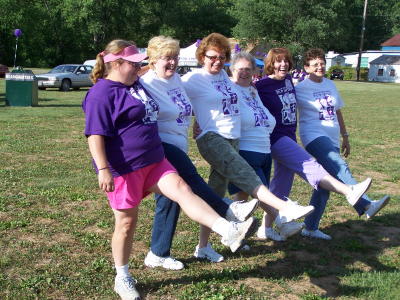 Relay for Life team leaders kick up their heels (L to R) Susan Johnson (Mary's Marchers), Molly Yoak (Heaven's Helpers), Sue Oshoway (E-Lemonaders), Tish Vannoy (Tish's Terminators), Jean Simers (Bosum Buddies), Carlene Frederick (Pleasant Hill Crusaders)