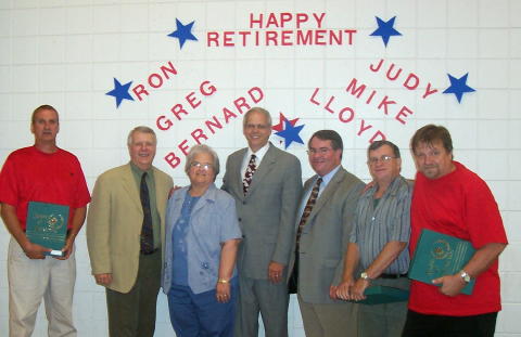 Retirees (L-R) Mike Stump, Larry Stinn, Judy Kerns, Greg Mr. Blankenship was surprised with a special retirement event. Former colleagues were invited to attend and help celebrate his 38 years of service. Service pins awarded to employees included - 5 years Dennis McCumbers, 10 years Karen Blankenship, Kristie Ritchie and Connie Summers; 15 years Paula Boggs, Roger Chenoweth, and Clyde Knotts; 20 years Kim Batten and Bill Queen; 25 years Linda Shock, Larry Stinn and Nancy Taylor; 30 years John Bennett, Jerry Fox, Jan Jarrell, and Ken Townsend; 35 years Dotti Nemitz and Kathy Wood; 40 years Judy Kerns