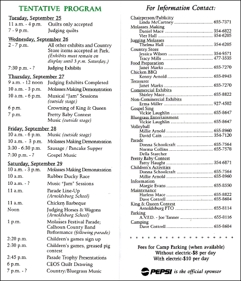 The 40th annual West Virginia Molasses Festival continues today at the West Fork Community Park in Arnoldsburg. The festival will include all the traditional events, molasses making demonstrations, exhibits, pancake supper, chicken barbecue, crowning of the King and Queen, Pretty Baby Contest, and the Grand Parade, to name a few. Other events will include a "Greased Pig" Round-Up, Rubber Ducky Race, lots of music and jam sessions, and games for the kids. The country Store will have everything from handmade quilts to homemade soap, by local artisans, sold in the tradition of old-fashioned store keepers. "We hope everyone will join us for a time of homecoming, renewing friendships and just having fun," said Linda McCartney, Chairperson. ** "Recipes from the Heart" - West Virginia Molasses Festival Cookbook will be sold during the festival. ** The 2007 Molasses Festival Baskets have arrived - anyone interested in purchasing the 6th Edition please contact Debbie Arnold 655-8943 or Kathy Conley 354-7525.